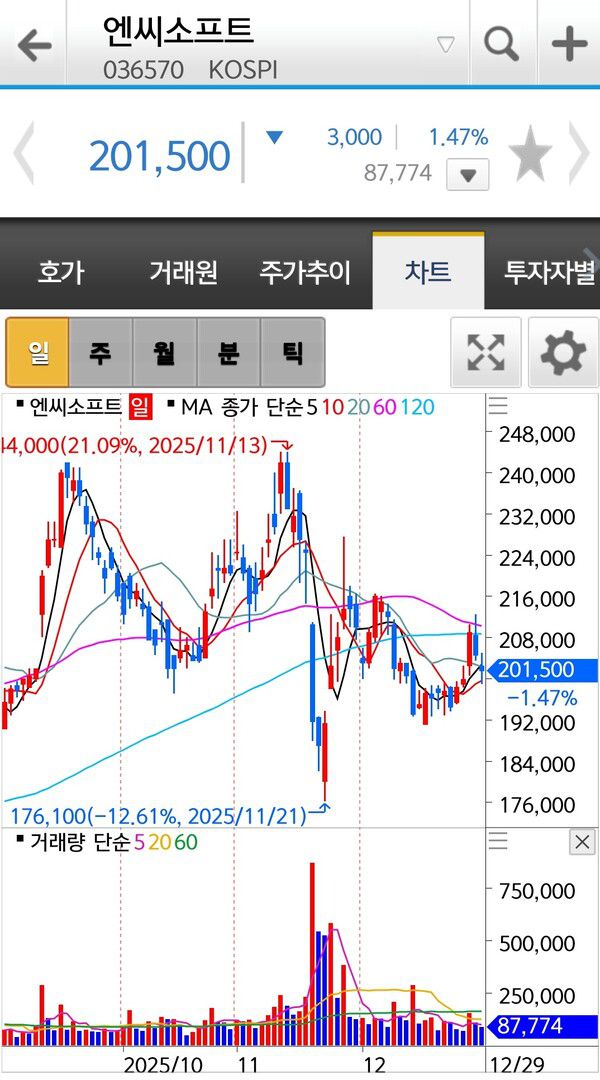 지난 9월 4일 [e겜스톡] 이후 엔씨소프트 일봉 차트 [사진: 신한투자증권 엔씨소프트 갈무리] |