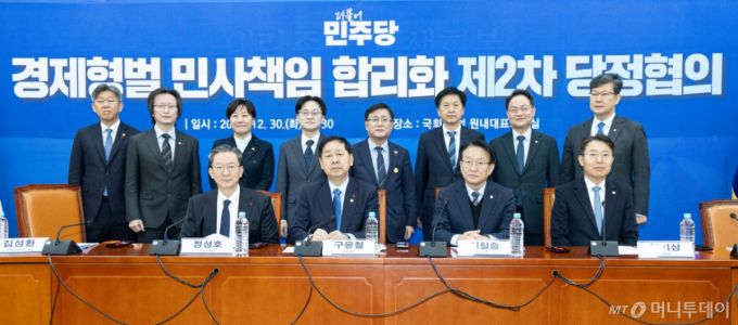 민주당 경제형벌민사책임합리화TF(태스크포스)는 30일 오전 서울 여의도 국회 본관에서 제2차 당정협의를 열었다. 당에선 권칠승TF 단장과 최기상, 허영, 오기형, 김남근 의원 등이 참석했고 정부에선 구윤철 경제부총리와 정성호 법무부 장관, 김성환 기후에너지노동부 장관, 김정관 산업부 장관 등이 참석했다.