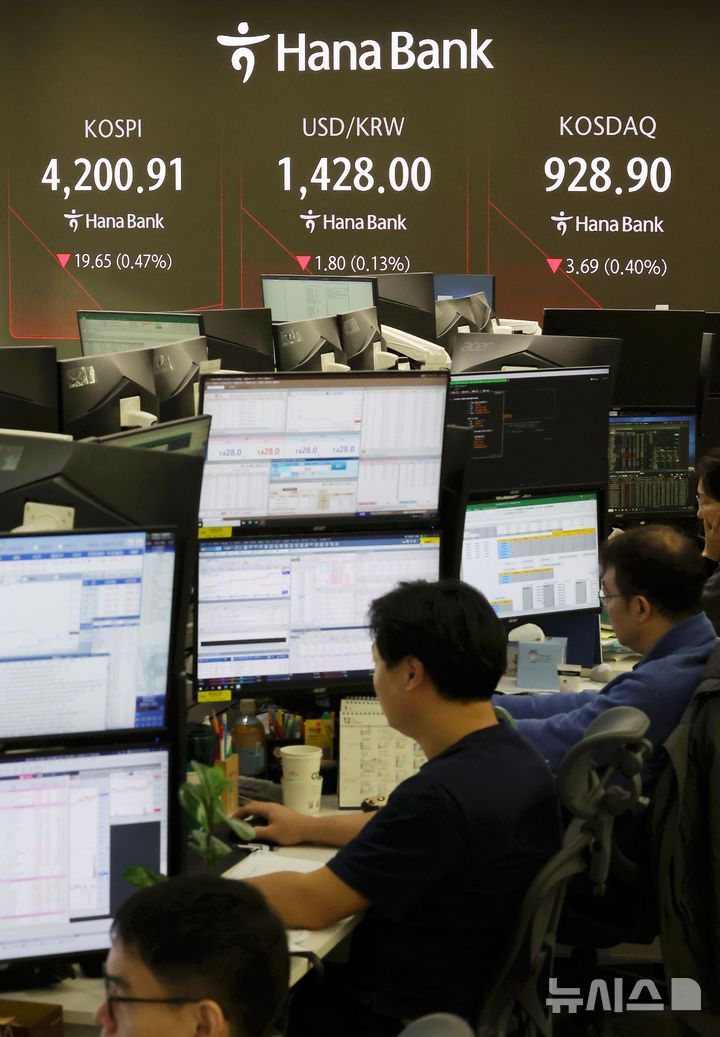 [서울=뉴시스] 홍효식 기자 = 코스피가 전 거래일(4220.56)보다 26.81포인트(0.64%) 내린 4193.75에 개장한 30일 오전 서울 중구 하나은행 딜링룸 전광판에 지수가 표시되고 있다.
