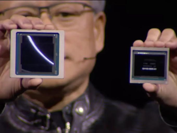 블랙웰(왼쪽)과 H100(오른쪽)을 들어 보이는 젠슨황 엔비디아 최고경영자 [사진=업체 제공] |