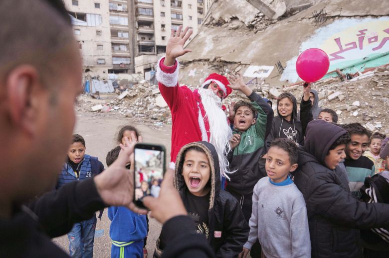 팔레스타인 어린이들이 산타와 기념 사진을 찍고 있다. AP=연합뉴스 |