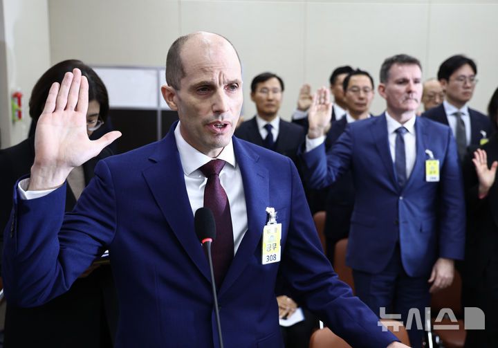[서울=뉴시스] 김명년 기자 = 해롤드 로저스 쿠팡 대표이사가 30일 오전 서울 여의도 국회에서 열린 쿠팡 침해사고 및 개인정보 유출, 불공정 거래, 노동환경 실태 파악과 재발방지 대책 마련을 위한 연석 청문회에서 선서하고 있다. 2025.12.30. kmn@newsis.com
