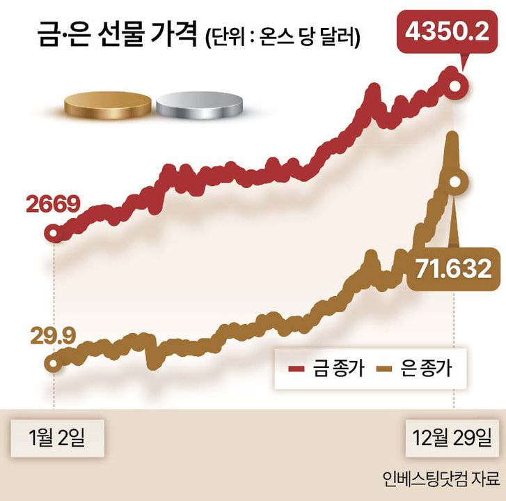 박승진 하나증권 연구원은 “금 대비 은 가격 스프레드가 정상화하는 과정”이라며 “은이 과도하게 저평가됐던 금/은 비율 80~100배 수준에서 60배 이하로 급격히 내려오는 흐름이 진행되고 있다”고 전했다.