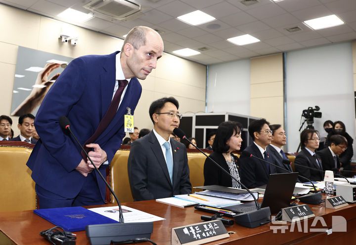[서울=뉴시스] 김명년 기자 = 해롤드 로저스 쿠팡 대표이사가 30일 오전 서울 여의도 국회에서 열린 쿠팡 침해사고 및 개인정보 유출, 불공정 거래, 노동환경 실태 파악과 재발방지 대책 마련을 위한 연석 청문회에서 인사하고 있다. 2025.12.30. kmn@newsis.com