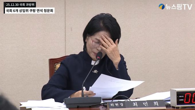 최민희 국회 과방위원장 30일 쿠팡 사태 연석 청문회에서 유족들의 이야기를 듣던 도중 울먹이고 있다. [사진=뉴스핌TV]