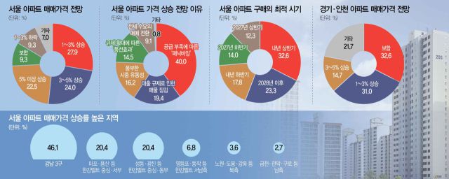 서울과 달리 경기·인천 지역의 아파트값 상승률은 제한적일 것으로 전망됐다. ‘내년 서울을 제외한 경기·인천의 아파트값 변동률을 어떻게 보는가’라는 질문에 전체 응답자의 32.6%가 ‘보합’을 예상했다. 또 31.0%는 ‘1~3% 상승’에 그칠 것으로 예측했다.