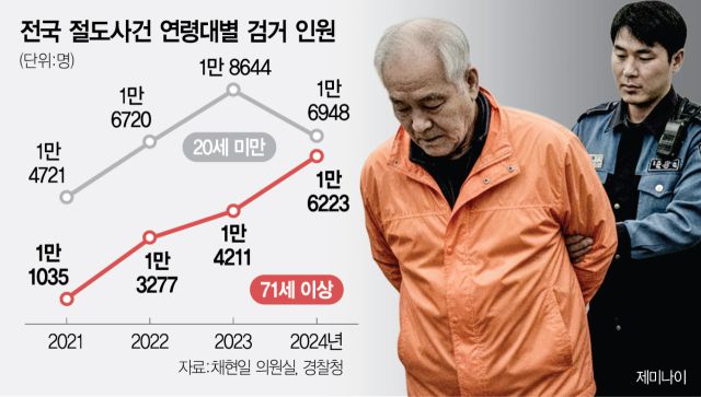 30일 국회 행정안전위원회 소속 채현일 더불어민주당 의원실이 경찰로부터 제출받은 자료에 따르면 지난해 검거된 전국 71세 이상 절도범은 1만 6223명으로 집계됐다. 2021년 1만 1035명과 비교하면 불과 3년 만에 47.0% 폭증한 수치다. 주목할 점은 속도다. 통계청 주민등록인구 현황을 분석한 결과 지난 3년간 70대 이상 인구 증가율은 약 13.9% 수준이었다. 고령층 인구가 늘어나는 속도보다 이들이 절도 범죄로 유입되는 속도가 약 3배 이상 빠른 셈이다.