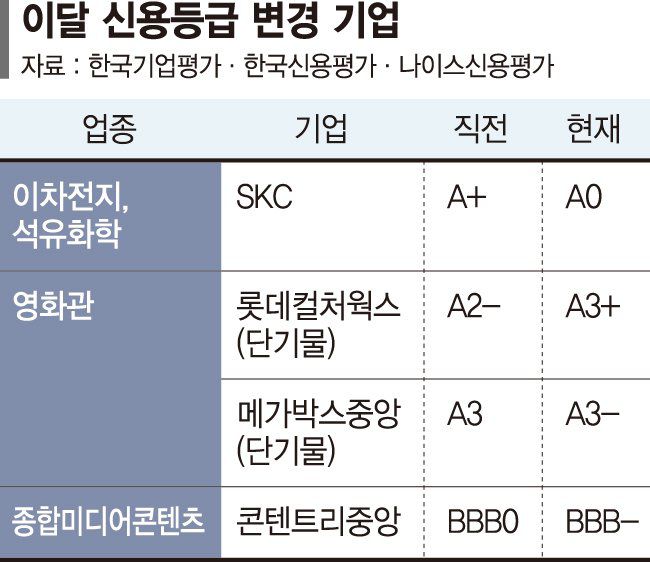 실제로 3대 신용평가사는 이달에만 SKC, 롯데컬처웍스, 포스코이앤씨 등 9개 기업의 신용등급 및 신용등급 전망 등을 줄줄이 하향 조정했다. 업황둔화를 겪고 있는 이차전지, 석유화학, 건설업, 영화산업을 영위하는 기업이 대부분이다. 그룹사로 보면 SK그룹 계열사가 절반을 차지했다. 최성종 NH투자증권 연구원은 회사채 시장에 대해 "부정적 신용등급 전망 부여의 영향으로 신용 스프레드가 확대됐다"고 말했다.
