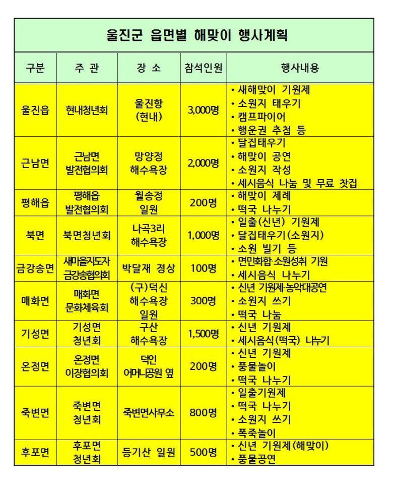 이 외에도 울진 현내항, 평해 월송정, 금강송면 박달재 정상, 후포 등기산 공원 등 각 읍면별 해맞이 명소 9곳에서도 신년 기원제, 풍물놀이 등의 다양한 볼거리와 따뜻한 떡국을 나누는 화합의 장이 마련된다.