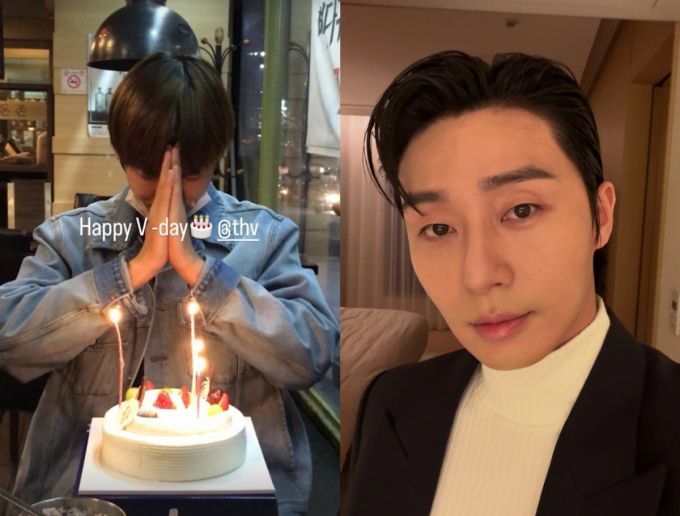 박서준은 30일 SNS(소셜미디어)에 "Happy V-day"라는 짧은 글과 함께 사진 한 장을 올렸다. 사진에는 뷔가 촛불이 켜진 케이크를 다리 위에 올려놓고 두 손을 가지런히 모은 채 소원을 비는 모습이 담겼다.