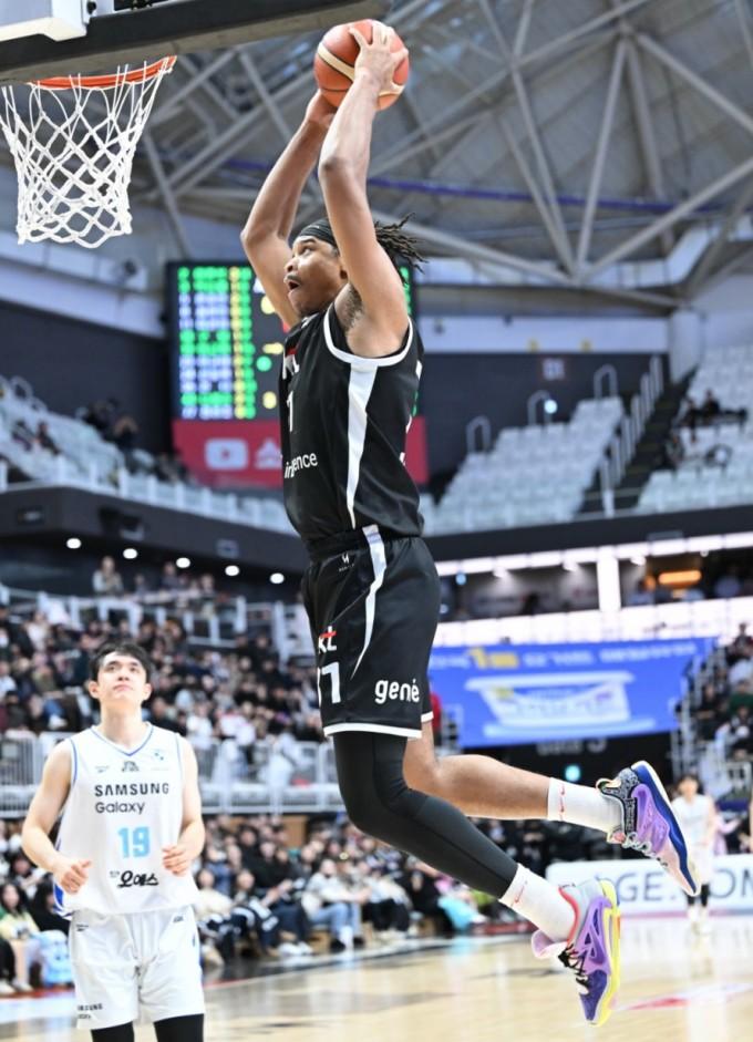 [서울=뉴스핌] 박상욱 기자 = kt 아이재아 힉스가 30일 프로농구 정규리그 서울 삼성과의 홈 경기에서 덩크슛을 터뜨리고 있다. [사진=KBL] 2025.12.30 psoq1337@newspim.com