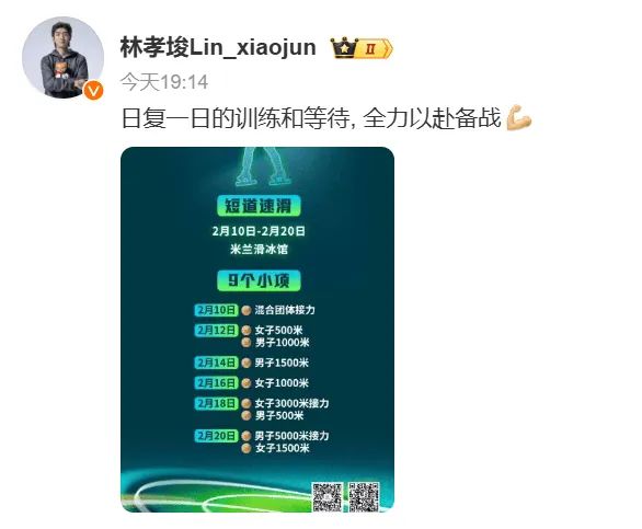 중국 쇼트트랙 대표팀의 린샤오쥔은 30일 자신의 웨이보를 통해 2026 밀라노코르티나 동계올림픽 쇼트트랙 경기 일정을 직접 공유하며 출격 준비가 끝났음을 알렸다.