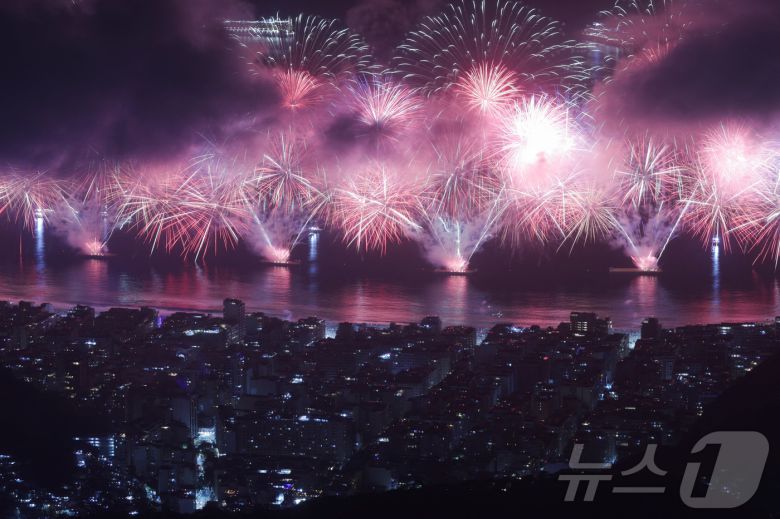 2025년 1월 1일 브라질 리우데자네이루 코파카바나 해변에서 열린 새해맞이 행사에서 불꽃놀이가 밤하늘을 화려하게 수놓고 있다. 2025.1.1./뉴스1 ⓒ 로이터=뉴스1 ⓒ News1 이창규 기자