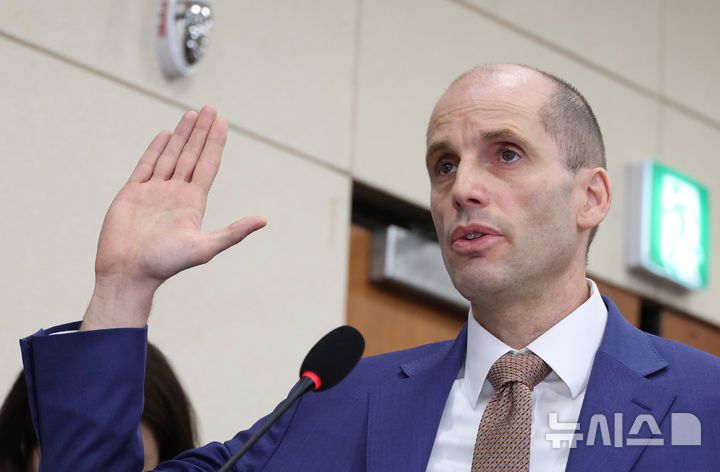 [서울=뉴시스] 김금보 기자 = 해롤드 로저스 쿠팡 대표이사가 31일 오전 서울 여의도 국회에서 열린 쿠팡 침해사고 및 개인정보 유출, 불공정 거래, 노동환경 실태 파악과 재발방지 대책 마련을 위한 연석 청문회에서 선서하고 있다. 2025.12.31. kgb@newsis.com |