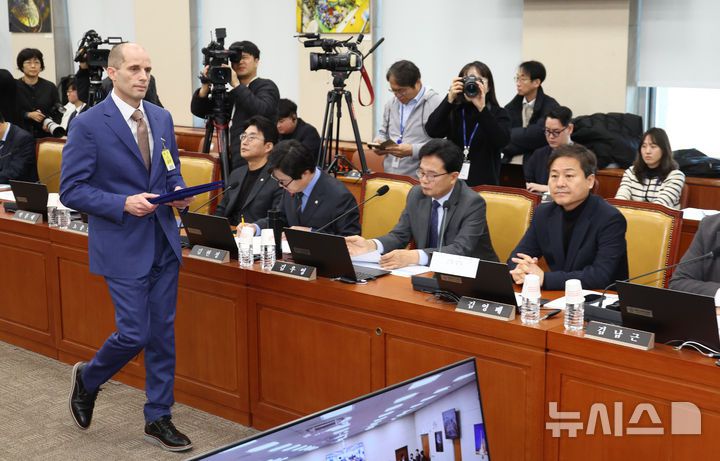 [서울=뉴시스] 김금보 기자 = 해롤드 로저스 쿠팡 대표이사가 31일 오전 서울 여의도 국회에서 열린 쿠팡 침해사고 및 개인정보 유출, 불공정 거래, 노동환경 실태 파악과 재발방지 대책 마련을 위한 연석 청문회에서 선서문을 제출하고 있다. 2025.12.31. kgb@newsis.com