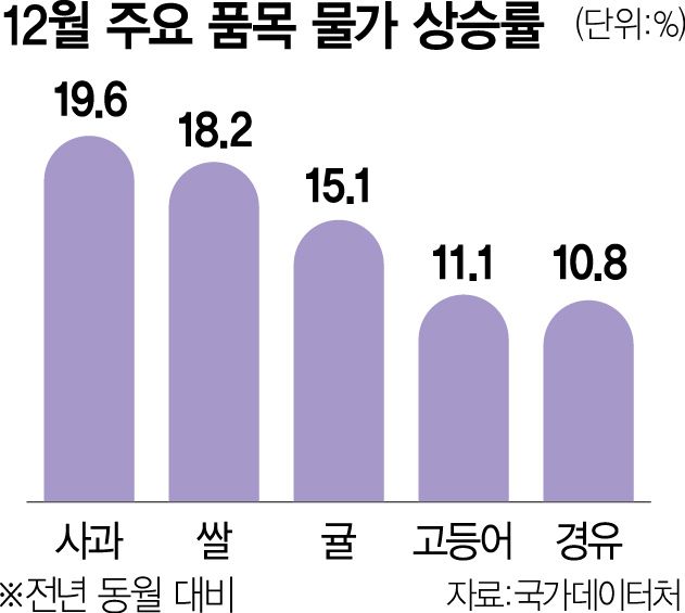 환율에 가장 민감하게 반응하는 석유류 가격 역시 급등세를 나타냈다. 12월 석유류 가격은 전년 동월 대비 6.1% 급등하며 지난해 2월(6.3%) 이후 10개월 만에 최대 상승 폭을 기록했다. 특히 경유는 10.8% 뛰었는데 이는 2023년 1월(15.5%) 이후 약 3년 만에 가장 큰 폭의 상승이다. 겨울에는 비닐하우스 작물과 축사 등에 기름을 많이 때기 때문에 석유류 가격 상승이 먹거리 가격 인상으로 전이될 가능성이 있다.