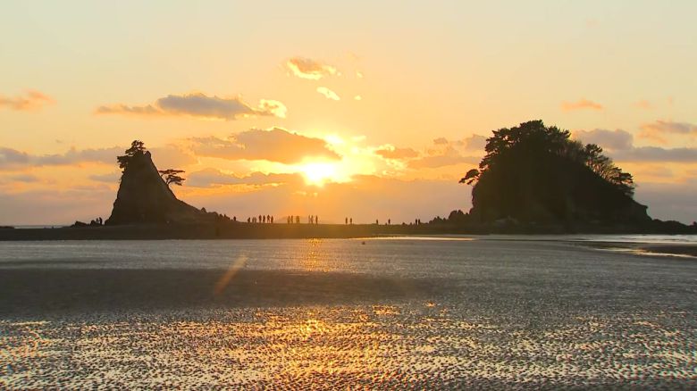 바닷물이 서서히 빠지면서 생긴 길을 따라 해넘이를 가까이서 보려는 관광객들이 바위 앞까지 걸어가는 모습도 볼 수 있습니다.