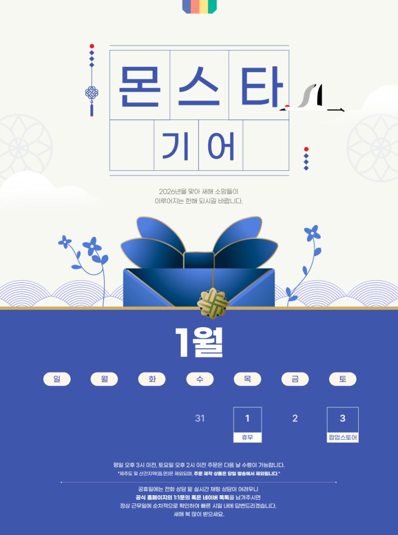 [디지털포스트(PC사랑)=임병선 기자] 커스텀 키보드와 혁신적인 입력기기인 몬스타덱을 통해 시장을 선도하고 있으며, 몬스타기어 브랜드로 게이밍 기어, 커스텀 수랭 쿨러, AI 딥러닝 등 하이엔드 PC 제조에 특화된 기업 몬스타주식회사가 2026년 새해를 맞아 1월 1일 본사 매장 휴무 일정과 함께 오는 1월 3일 광복점 팝업스토어 앵콜 오픈 소식을 전했다.