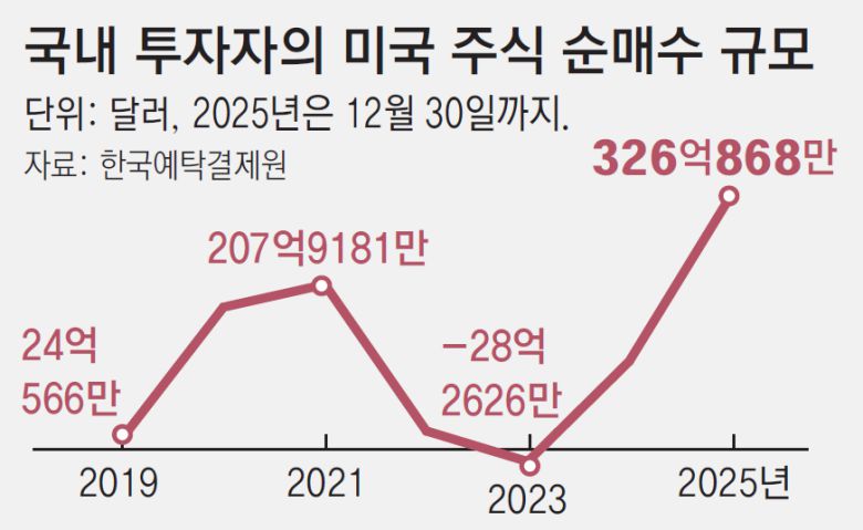 31일 한국예탁결제원에 따르면 국내 투자자는 지난해 1월 2일부터 12월 30일까지 326억868만 달러(약 47조54억 원) 규모의 미국 주식을 순매수했다.