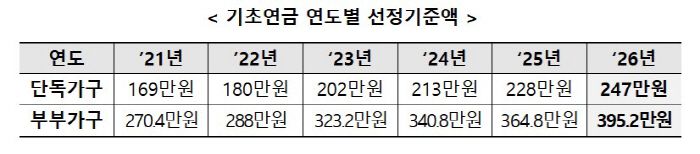 노인 단독가구 월 247만 원·부부가구 월 395만 2000원 이하…올해 기초연금 선정기준액 결정