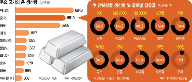 관련 시장에서는 중국의 지배적 위치에 주목하고 있다. 중국은 강력한 정제·가공 능력을 갖춘 세계 최대의 은 생산국 중 한 곳인 동시에 매장량도 세계 최대 수준이다. 중국의 지난해 은 생산량은 5910톤으로 멕시코(6843톤)에 이어 세계 2위다. 지난해 전 세계 은 무역량에서 중국은 약 23%를 차지했다. 글로벌 정제 능력 91%를 자랑하는 희토류보다는 낮은 비중이지만 글로벌 공급망을 좌지우지할 수 있는 수준이다. 프랑스 투자은행 나틱시스의 한 애널리스트는 “중국이 수출허가 요건을 매우 엄격하게 적용할 경우 은 가격이 트로이온스당 100달러(약 14만 원)에 달할 수도 있다”고 우려했다. 실제로 중국은 전략 광물 수출통제를 대외 협상 카드로 활용해왔다. 2023년에는 갈륨과 게르마늄, 2024년에는 안티모니, 지난해에는 희토류인 네오디뮴과 디스프로슘으로 통제 범위를 넓혔다. 중국은 전 세계 갈륨 생산량의 99%, 텅스텐의 83%, 비스무트의 81%를 차지하고 있다. 흑연과 텔루륨·규소·인듐·바나듐도 70% 이상의 점유율로 세계 1위다.