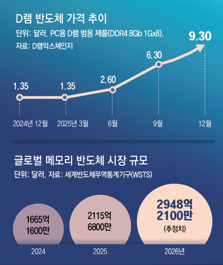 세계반도체무역통계기구(WSTS)는 올해 글로벌 메모리 반도체 시장 규모가 지난해보다 약 40% 성장한 2948억2100만 달러(약 426조6060억 원)에 이를 것으로 전망했다.