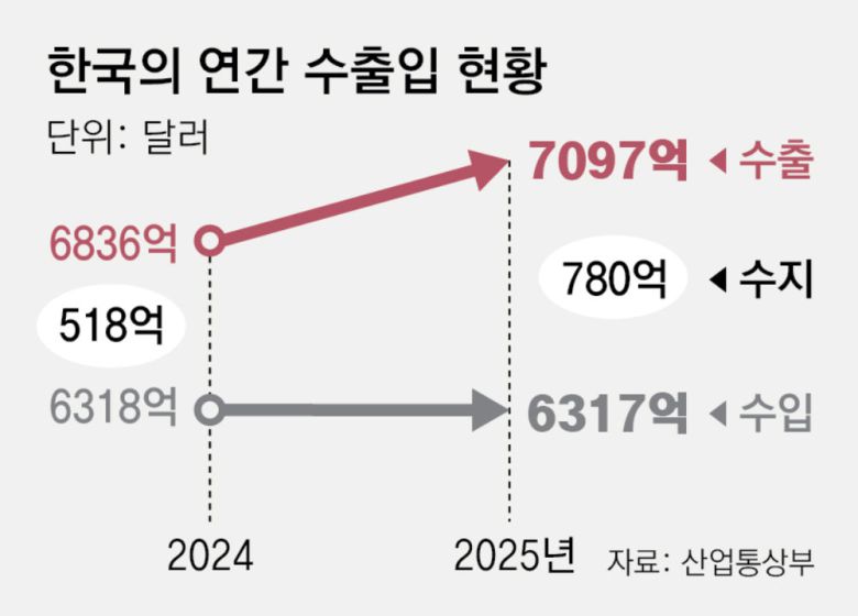 최근 산업연구원(KIET)이 발표한 ‘2026년 경제·산업 전망’에 따르면 올해 한국의 수출 실적은 6971억 달러에 머물 것으로 예상된다. 반도체, 정보기술(IT), 바이오헬스 등에서 증가세가 예상되지만 정유, 철강, 선박 등의 부진이 전체 실적을 제약할 것이란 분석이다. 이날 산업통상부에 따르면 지난해 한국 수출액은 총 7097억 달러(잠정치)로 전년 대비 3.8% 증가했다. KIET의 예상대로라면 올해 한국 수출 실적은 1.8% 역성장하게 된다.