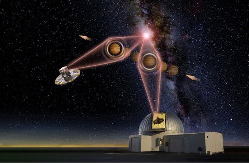 KMTNet과 가이아 우주망원경의 '나홀로 행성' 관측 상상도한국천문연구원(KASI) 외계행성탐색시스템(KMTNet.지상망원경)과 유럽우주국(ESA) 가이아(Gaia) 우주망원경이 동시에 지구에서 1만광년 떨어져 있는 '나홀로 행성'을 관측할 때를 나타낸 가상도[한국천문연구원·Yu Jingchuan 제공. 재판매 및 DB 금지]