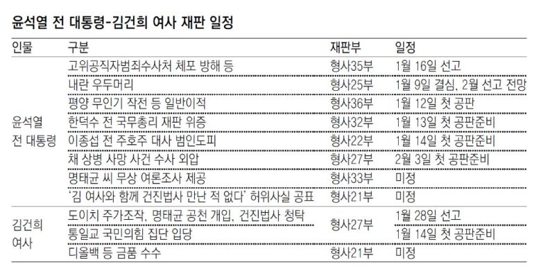 지난해 12월 28일 김건희 특검(특별검사 민중기)을 마지막으로 3대 특검이 모두 마무리되면서 새해 초부터 법원에서 윤석열 전 대통령과 김건희 여사에 대한 주요 재판의 구형 및 선고가 연달아 이뤄질 예정이다. 우선 9일에는 윤 전 대통령 내란 우두머리 사건의 결심 공판이, 16일에는 체포 방해 혐의 사건 선고가 진행된다.