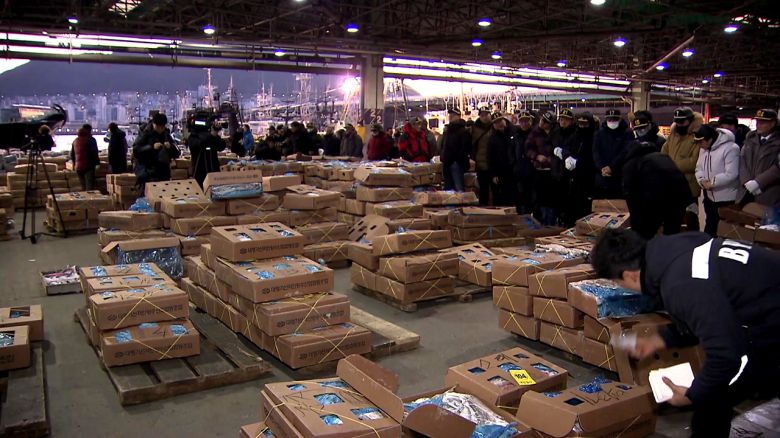 바닥에 가득 깔린 수산물 주위로 사람들이 몰려들었습니다.