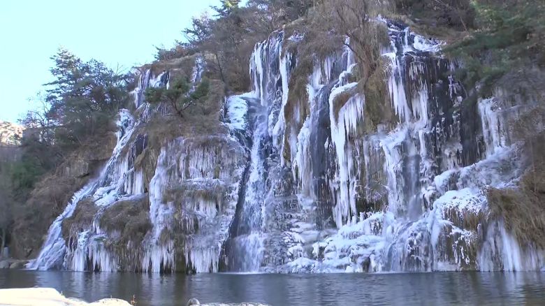 그림 같은 도심 폭포도 오늘은 그대로 얼어붙어 얼음조각으로 변해버렸고요, 추위 탓에 시민들이 모두 실내로 향하면서 폭포 주변은 다소 한산한 분위기입니다.