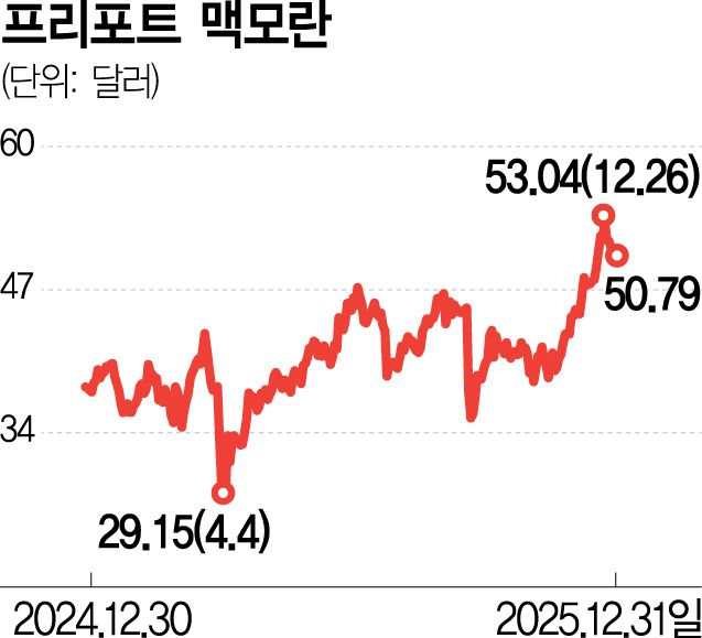 지난달 30일 기준 금 선물 가격은 온스당 4339달러로 작년 한 해 동안 65% 상승했고, 은 가격은 같은 기간 158% 급등했다. 구리 3개월물 선물 가격 역시 연초 대비 43.2% 오르며 강한 상승세를 이어왔다. 프리포트 맥모란의 주가는 지난 한 해 동안 약 37% 상승했으며, 상승분은 대체로 연말에 집중됐다. 구리 가격 반등과 맞물려 실적 기대감이 빠르게 반영된 결과로 풀이된다.