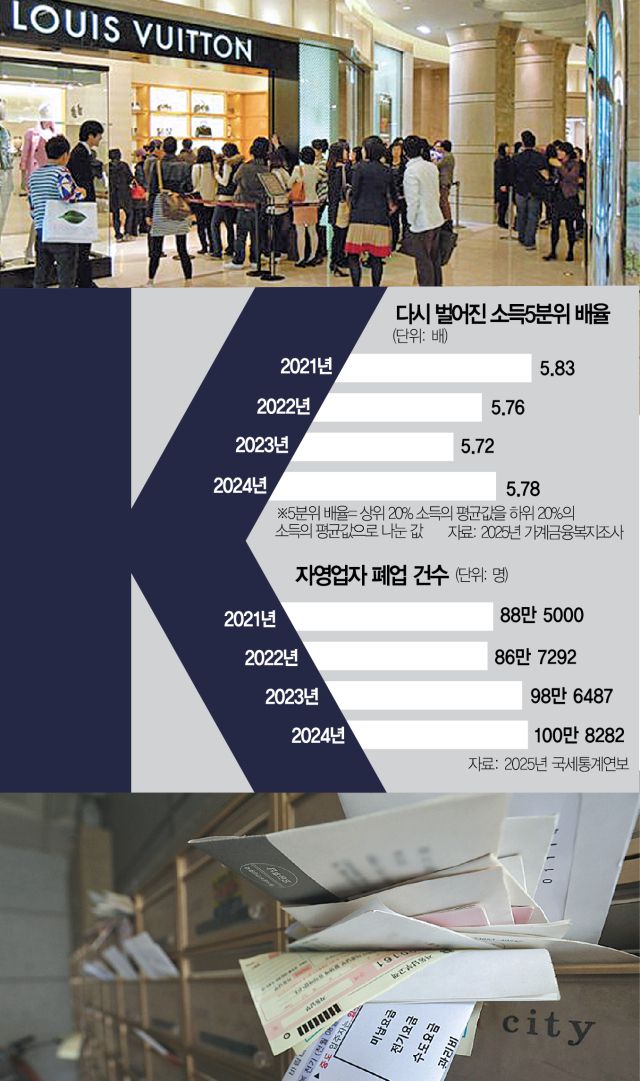 경제의 허리를 지탱하는 중소기업과 소상공인들의 상황은 더욱 절망적이다. 한국은행의 ‘2024년 기업경영분석 결과’에 따르면 대기업은 수출 호조로 매출액 증가율(4.4%)과 영업이익률(5.6%) 등 주요 지표에서 반등에 성공했다. 반면 중소기업의 매출액 증가율은 3.2%에 그쳤고 영업이익률은 4.6%로 0.2%포인트 하락했다. 수익성이 악화되면서 한계기업 중 중소기업 비중은 35.2%로 1.7%포인트 증가했다. 자영업자 역시 2024년 폐업 건수가 사상 처음으로 100만 명을 넘어선 데 이어 개인사업자 대출 연체율이 0.98%까지 치솟는 등 한계 상황에 몰려 있다.
