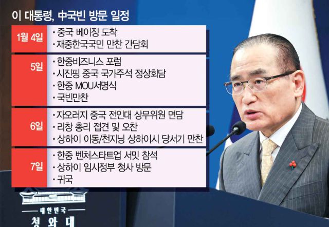 경제 일정도 계속 이어질 예정이다. 이 대통령은 5일 한중 비즈니스 포럼에 참석한 뒤 이날 정상회담에서 MOU를 체결한다. 위 실장은 “경제, 산업, 기후 환경, 교통 분야 등에 걸친 MOU를 10건 이상 준비하고 있다”고 말했다. 6일에는 중국의 ‘경제사령탑’ 리창 국무원 총리를 접견한 뒤 상하이로 옮겨 천지닝 상하이시 당 서기와의 만찬을 갖고 이튿날인 7일 한중 벤처 스타트업 서밋에 참석한다.