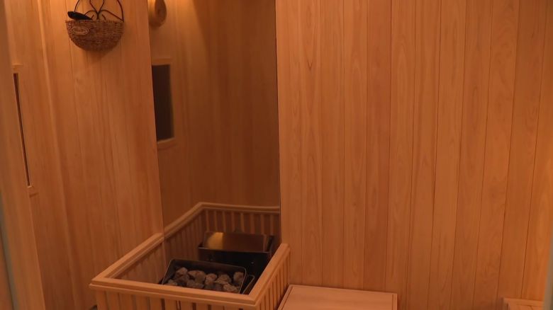 편백 나무로 마감된 시설 내부에선 스토브와 건식 사우나용 돌들이 보입니다.