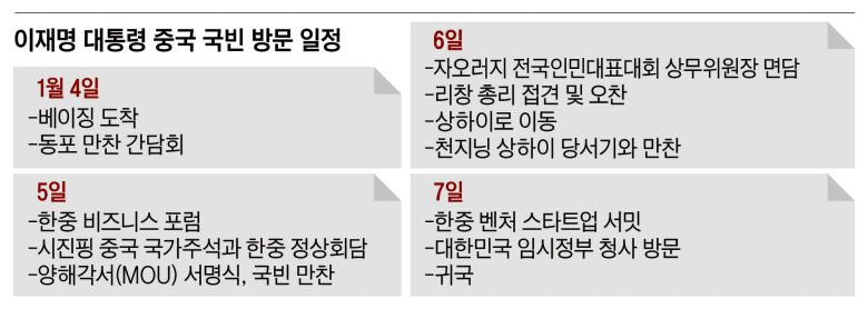 한국 대통령으로는 9년 만에 중국을 국빈 방문하는 이 대통령은 오는 5일 베이징에서 시진핑 주석과 정상회담 및 국빈만찬을 한다. 6일엔 중국 서열 3위인 자오러지 전국인민대표대회 상무위원장과 면담하고, 중국의 경제사령탑인 리창 총리와 오찬도 할 예정이다. 그 후 상하이로 이동해 6일 오후 천지닝 상하이 당 서기와 만나고, 7일 대한민국 임시정부 청사를 방문한다.