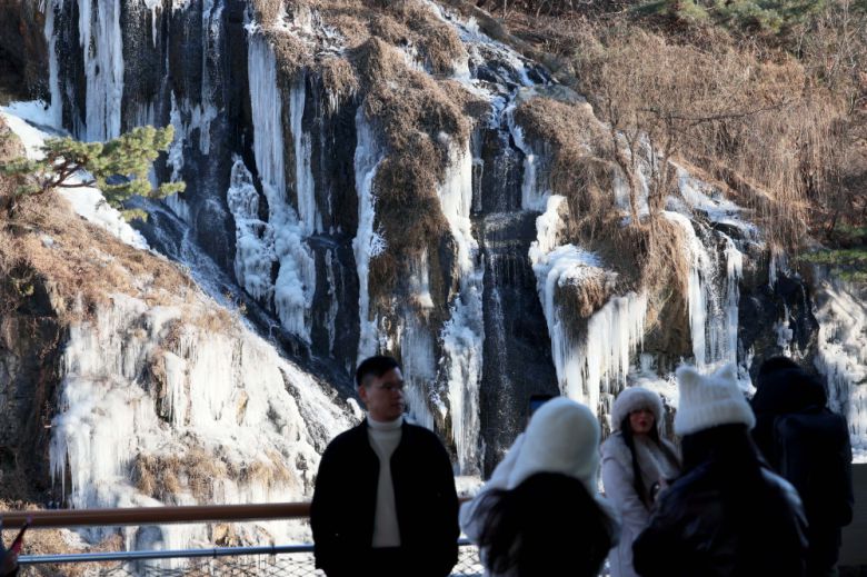전국에 세초 한파가 이어진 2일 서울 서대문구 홍제천 인공폭포가 얼어붙어 있다. 신태현 기자 holjjak@ |