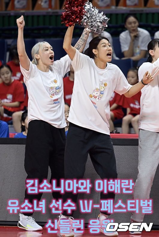 [OSEN=부산, 이석우 기자] 여자프로농구 김소니아(BNK)와 이해란(삼성생명)이 3일 부산 사직실내체육관에서 열린 BNK금융 2025-2026 여자프로농구 올스타 페스티벌에 참가한 부산 유소녀 선수들의 W-페스티벌 경기에서 신나는 응원을 하고 있다. / foto0307@osen.co.kr