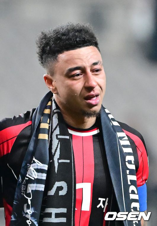 [OSEN=서월월드컵경기장, 박준형 기자] 제시 린가드(33, 서울)의 라스트 댄스는 무승부로 끝났다.FC서울은 10일 오후 서울월드컵경기장에서 2025~2026시즌 아시아축구연맹(AFC) 챔피언스리그 엘리트(ACLE) 리그 스테이지에서 린가드의 선제골이 터졌지만 지키지 못하고 멜버른 시티와 1-1로 비겼다.서울(2승3무1패, 승점 9)은 5위로 밀렸다. 멜버른 스티(3승1무2패, 승점 10점)는 4위다.경기종료 후 FC서울 린가드 고별행사에서 린가드가 눈물을 보이고 있다.  2025.12.10 / soul1014@osen.co.kr