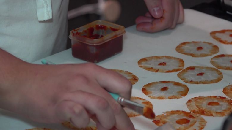 마치 수채화 작품을 그리듯 라이스 페이퍼 위로 붉은색 양념을 덧바릅니다.