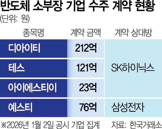 같은 날 국내 반도체 소부장 기업들도 잇달아 수주 소식을 전했다. 반도체 어닐링(열처리 공정) 장비 전문 기업 디아이티(110990)는 지난해 매출액의 약 18%에 해당하는 212억 원어치의 장비 공급 계약을 SK하이닉스와 체결했다. 고대역폭메모리(HBM) 반도체 장비 생산을 주력으로 하는 아이에스티이(212710)도 SK하이닉스와 23억 원 규모의 계약 체결 소식을 알렸고, 예스티(122640) 역시 삼성전자와의 76억 원 규모 수주 계약을 맺었다. 공시 당일 해당 기업들의 주가는 대형 메모리 업체들의 수주가 앞으로도 계속될 것이란 기대 속에 자금이 몰리며 모두 큰 폭으로 올랐다.