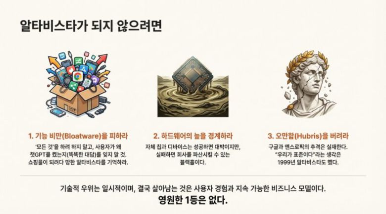또 하나의 공통 위험은 확장 전략이다. 알타비스타는 검색의 본질을 유지하기보다 뉴스, 쇼핑, 이메일을 아우르는 포털로 변신을 시도했고, 이는 사용자 경험의 분산으로 이어졌다. 오픈AI 또한 챗GPT에 검색, 이미지 생성, 코드 작성, 음성 대화 기능을 통합하며 기능 비대화 조짐을 보이고 있다. 플랫폼 확장이라는 명분 아래 서비스가 무거워질 경우, 핵심 경험의 선명도가 흐려질 수 있다는 점에서 유사한 고민이 제기된다.