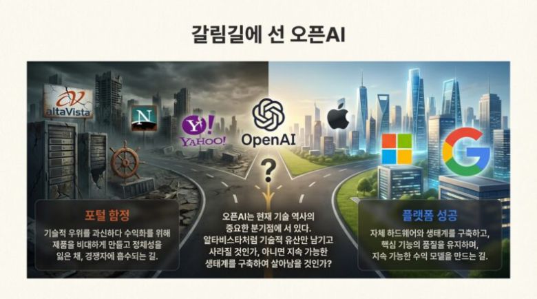 오픈AI는 갈림길에 서 있다. 자체 칩 개발과 디바이스 생태계 구축을 통해 인프라 주도권을 확보하는 방향과, 서비스 확장을 통해 플랫폼 체류 시간을 늘리는 방향 중 선택의 문제다. 엔비디아에 대한 의존도를 낮추기 위한 ASIC 개발, 그리고 챗GPT의 핵심 역할을 ‘다기능 도구’가 아닌 ‘지능형 비서’로 명확히 정의할 수 있을지가 향후 성패를 가를 변수로 꼽힌다. 알타비스타의 전례는 기술 선도 기업이라도 전략적 집중을 잃을 경우 빠르게 주변화될 수 있음을 보여준다. 2026년은 오픈AI가 이 흐름을 피할 수 있을지 가늠하는 분기점이 될 가능성이 크다.