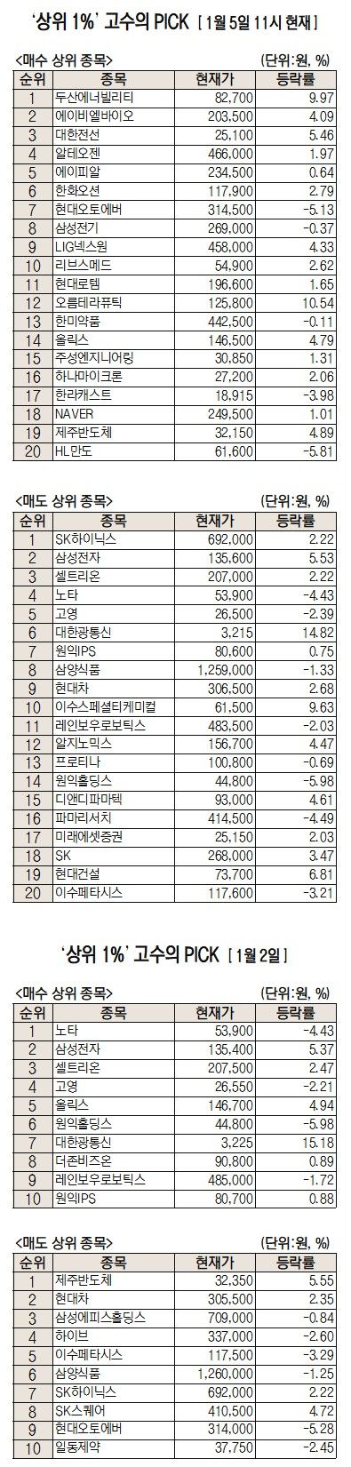 전일 기준으로는 고수익 투자자들의 순매수 상위 종목에 노타(486990)와 삼성전자, 셀트리온이 이름을 올렸다. 순매도 상위 종목은 제주반도체(080220), 현대차(005380), 삼성에피스홀딩스(0126Z0) 등이었다.