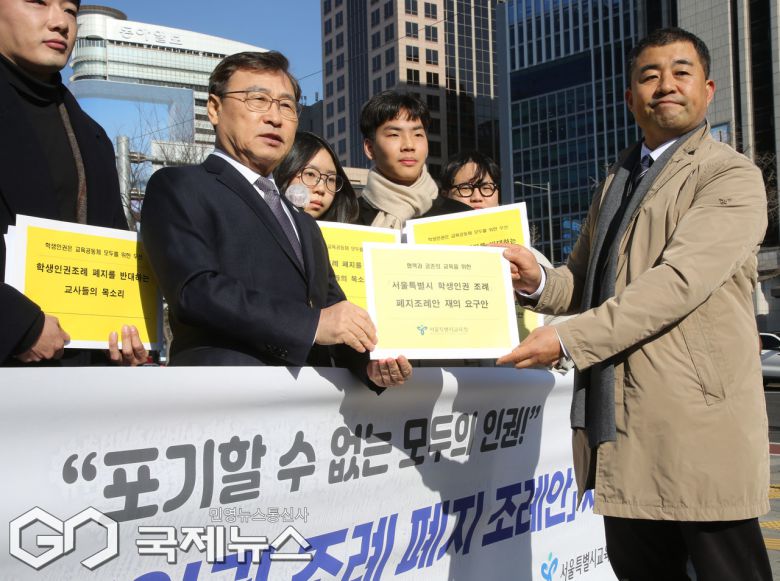 (서울=국제뉴스) 정근식 서울시교육감이 5일 오후 서울시 중구 세종대로 서울시의회 앞에서 학생, 교사 등과 함께 '서울특별시 학생인권 조례 폐지 조례안' 재의요구 입장을 밝힌 뒤 조백기 서울시교육청 학생인권옹호관에게 '서울특별시 학생인권 조례 폐지 조례안 재의 요구안'을 전달하고 있다.정 교육감은 "학생인권조례는 학생의 기본적 인권을 보호하기 위한 최소한의 제도"라며 "(학생인권 조례 폐지는) 학생의 기본권 보호 체계를 전면 해체하는 중대한 위헌·위법 행위이며, 공교육의 책임과 공익을 훼손하는 결정"이라고 입장을 밝혔다./사진=이용우 기자