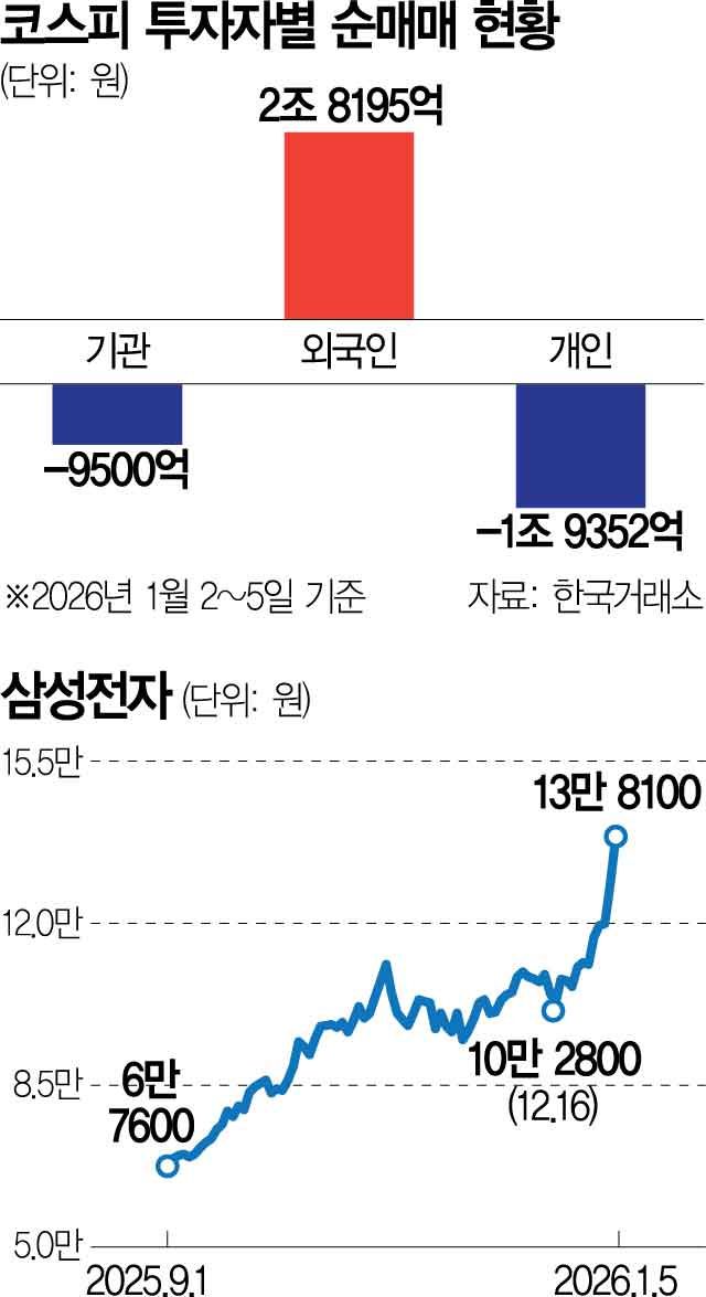 반도체 실적 기대감과 중장기적인 장밋빛 전망이 외국인 매수를 자극하고 있다는 분석이다. 글로벌 투자은행(IB)들은 최근 연달아 삼성전자·SK하이닉스의 목표치를 상향 조정했다. 모건스탠리는 SK하이닉스의 목표치를 84만 원, CLSA는 84만 5000원으로 올려 잡았다. 이달 8일 삼성전자의 2025년 4분기 잠정 실적 발표를 앞두고 있는 가운데 최근 수출 데이터를 감안하면 어닝 서프라이즈 가능성도 거론된다.