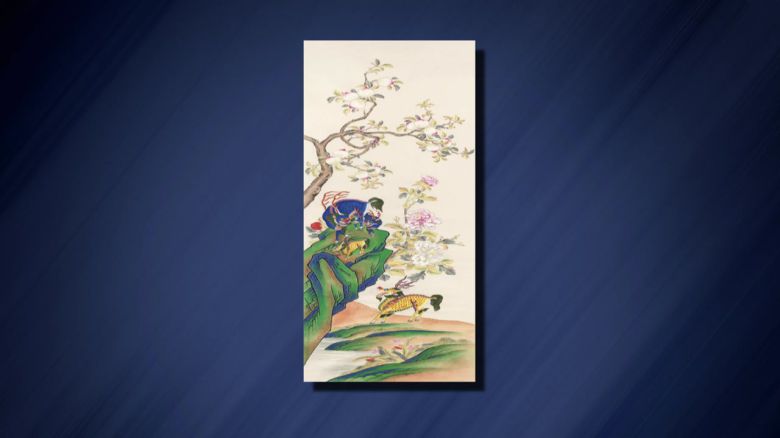 중국 전설 속 상상의 동물인 기린은 성인의 출현과 태평성대를 상징하고, 기린도에 함께 그려진 천도복숭아는 장수·불로를 뜻합니다.