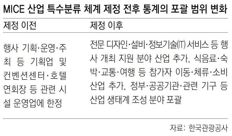 각종 행사가 개최되면 행사 기획이나 호텔 등의 회의장 대관 매출이 발생할 뿐 아니라 부스 설치와 홍보, 통역을 비롯한 행사 준비 및 참가자의 숙박, 교통, 쇼핑 등에서도 대량의 부가가치가 발생한다. 하지만 기존엔 국제회의 기획업·시설업 등 일부 업종에 대해서만 통계가 작성됐던 탓에 통계가 연관 산업에 대한 경제효과를 충분히 반영하지 못한다는 지적을 받아 왔다. 특정 산업이 포괄하는 범위를 담은 한국표준산업분류(KSIC)에서 MICE 산업이 독립된 산업으로 정의되지 않았기 때문이다.