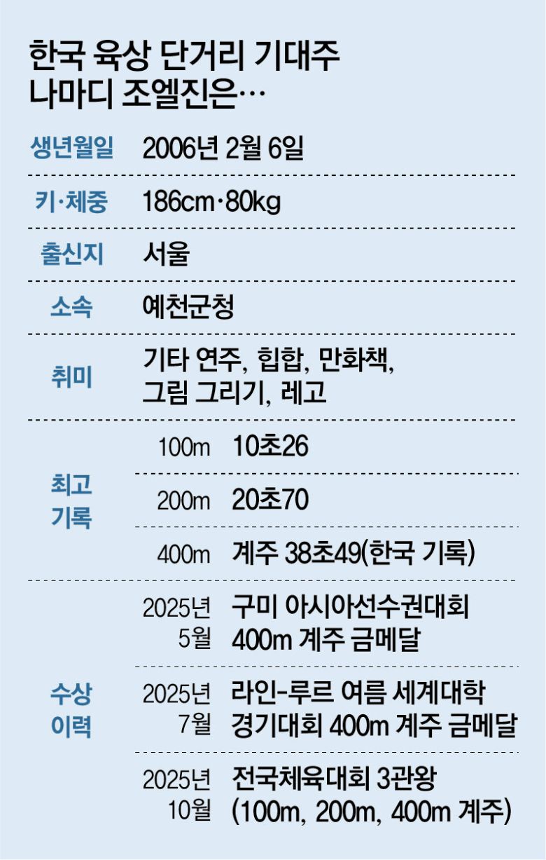 조엘진은 김국영(35·은퇴)이 보유한 한국 100m 기록(10초07)에 가장 근접한 선수로 평가받는다. 2024년 100m 한국 고등부 기록(10초30)을 갈아치운 그는 지난해 성인 무대에 데뷔하자마자 9월 홍콩에서 열린 20세 이하 동아시아선수권대회에서 10초26까지 개인 기록을 단축했다. 이후 부산에서 열린 제106회 전국체육대회(전국체전)에서는 100m, 200m, 400m 계주를 모두 석권하며 3관왕에 올랐다.