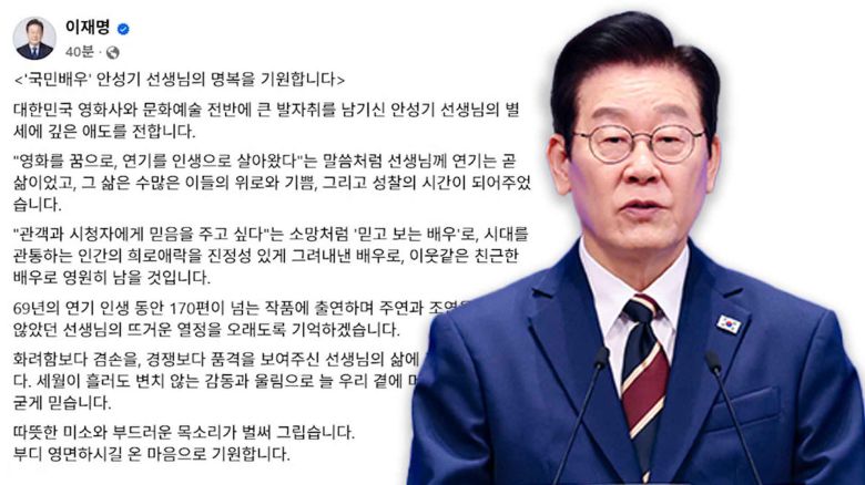 이재명 대통령이 안성기 배우 별세에 "시대를 관통하는 인간의 희로애락을 진정성 있게 그려낸 배우로 영원히 남을 것"이라고 추모했습니다.